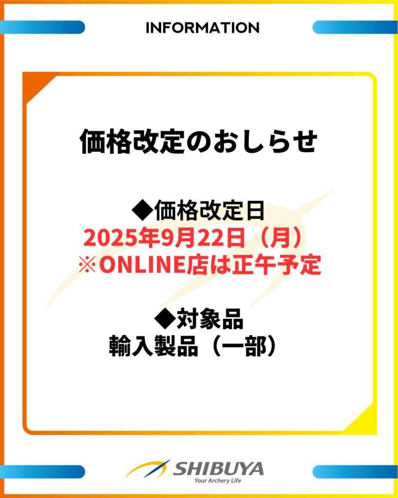 SHIBUYAアーチェリーでは9/22より、一部輸入品の価格改定を行うこととなりました。