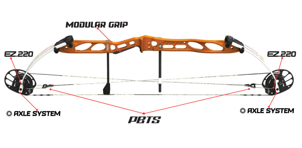 PSE伝統のハンドル削り出しのロープロファイル(0度)グリップに加えて、3種類のアングルのモジュラーグリップが同梱されています。0°・4°・8°・12°のアングルから、手首の緊張を軽減し、自然な押手のラインでグリップできるようカスタマイズ可能です。出荷時には4°のモジュラーグリップがセットされています。