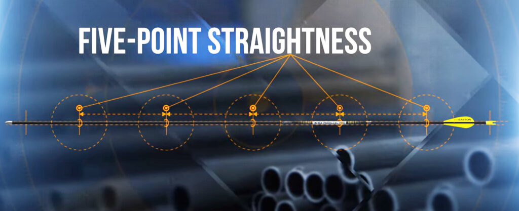 イーストンの競技用カーボンシャフトは全長方向の5か所でブレをチェックして、まっすぐさを管理しています。リリースした時、ストリングはノックを介して矢を押し出すので、ノックエンドの部分の精度は的中に致命的な影響を及ぼします。イーストンのカーボンシャフトは、ノックエンドの部分のまっすぐさも厳密に管理されているので安心ですね。