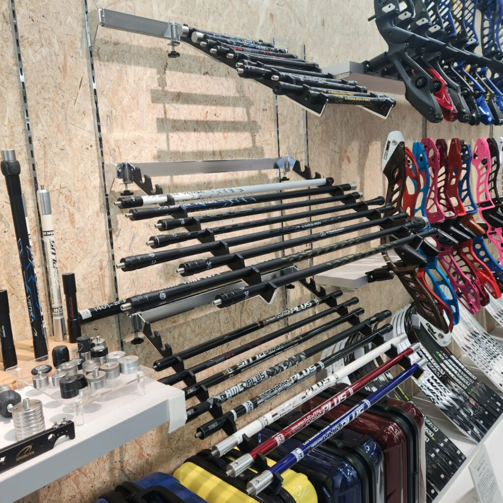 展示も見やすく、手に取りやすくなっています。HOYT、WIN&WIN、NISHIKAWAなどのリカーブハンドルや試射用リム、マシューズやPSEなどコンパウンドボウも充実。実際に手に取って、質感や重量感など確かめられます。