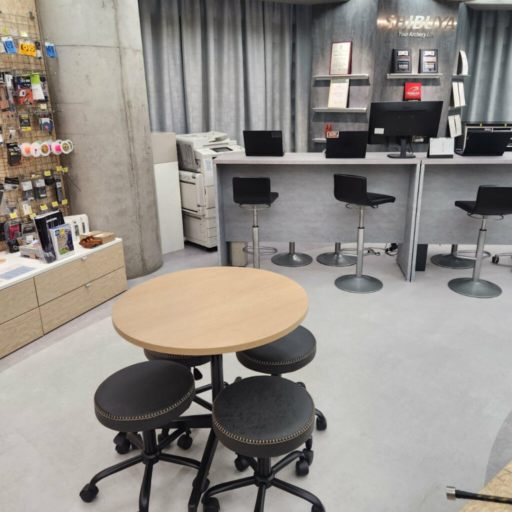 落ち着いて相談できる商談スペースも新設。初めての弓選びから理医務のグレードアップなど弓具の買い替え相談、クラブ単位の購入相談など、経験豊富なスタッフが丁寧にサポートいたします。