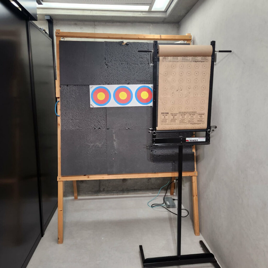 店内には近射スペースを設置。弓具の調整、リム、スタビライザーの試射などはもちろん、ドローイングマシン、ペーパーチューニングスタンドやボウプレスも完備しおり、様々なチューニングに対応しています。近射スペースでは、射型のワンポイントレッスンやCPL(コンパウンドボウのレッスン)などビギナーから競技志向の方まで対応したレッスンも実施しています。