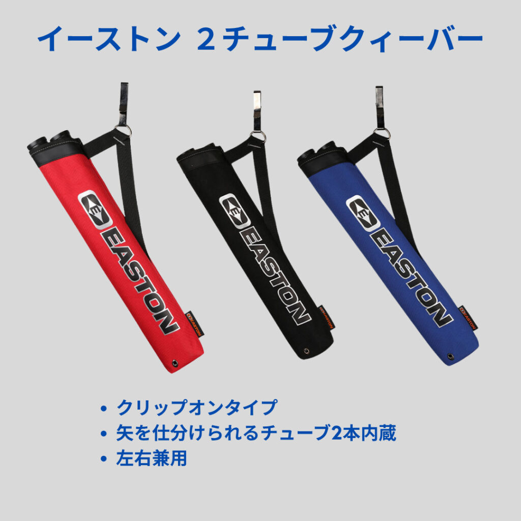 クィーバーは矢を入れて腰に提げるための弓具です。クリップオンタイプの簡単なものからタブや工具などを収納するアクセサリーポケット付きのトーナメントタイプまでいろいろあります。