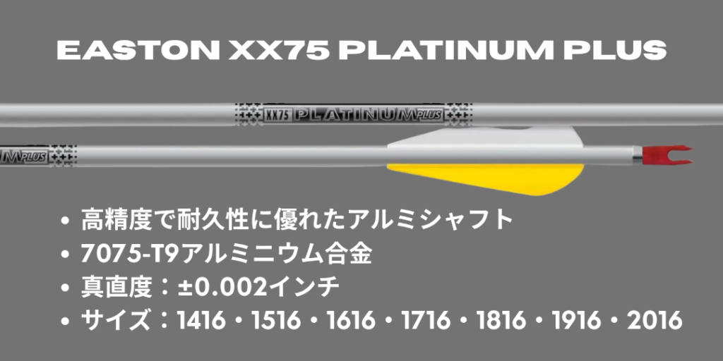 - イーストン プラチナムプラス アローシャフト:高精度で耐久性の高い7075アルミニウム合金のアローシャフト。オリンピックで圧倒的な使用率を誇るメーカー、イーストン社製です!