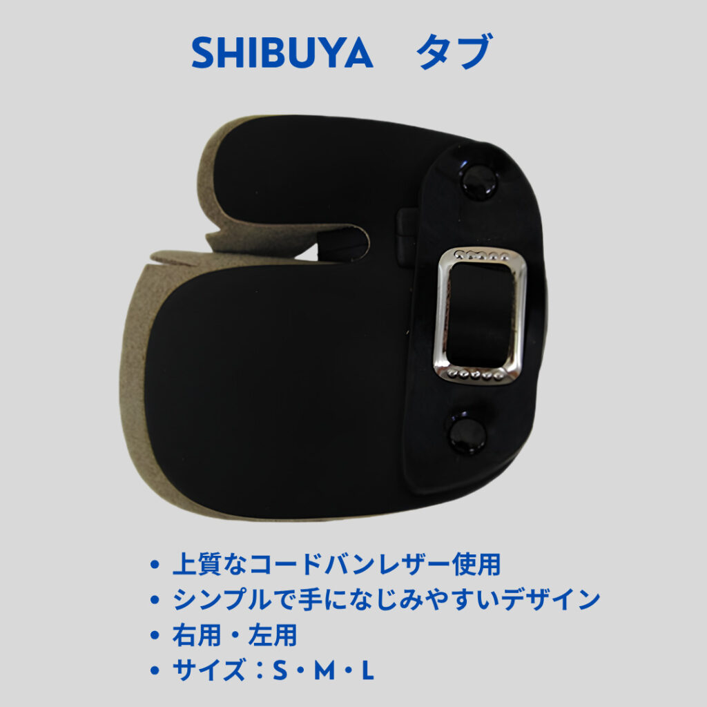 - タブ:指先をストリングの摩擦から守るプロテクター。上質なコードバンレザーを使用。
